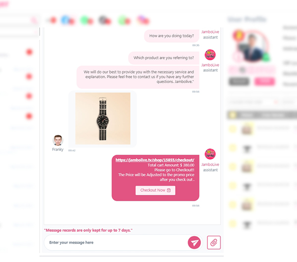 買家的相關購物內容可以同步了解,並同時建立訂單直接傳送結單連結給買家,提高購物轉化率。