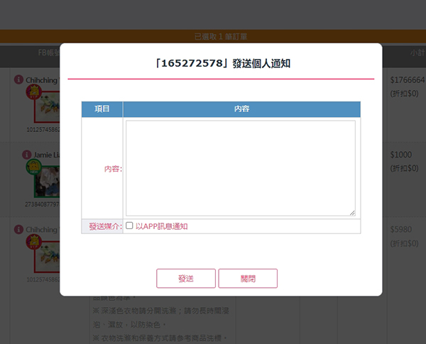 可以針對訂單發送個人通知,買家只要下載APP可以立即收到通知訊息。