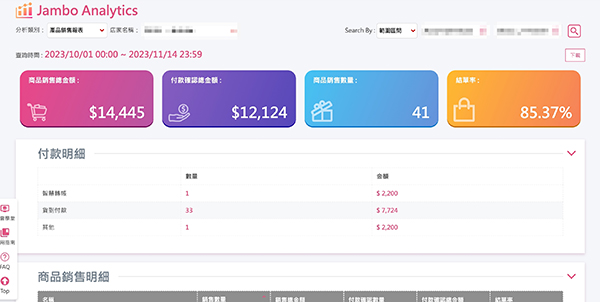 商品銷售分析工具讓您了解每一件商品的銷售表現,還能洞察背後的消費趨勢。它指引您了解哪些特點使得商品受歡迎,讓您的商品與市場需求同步,銷量穩步增長。
